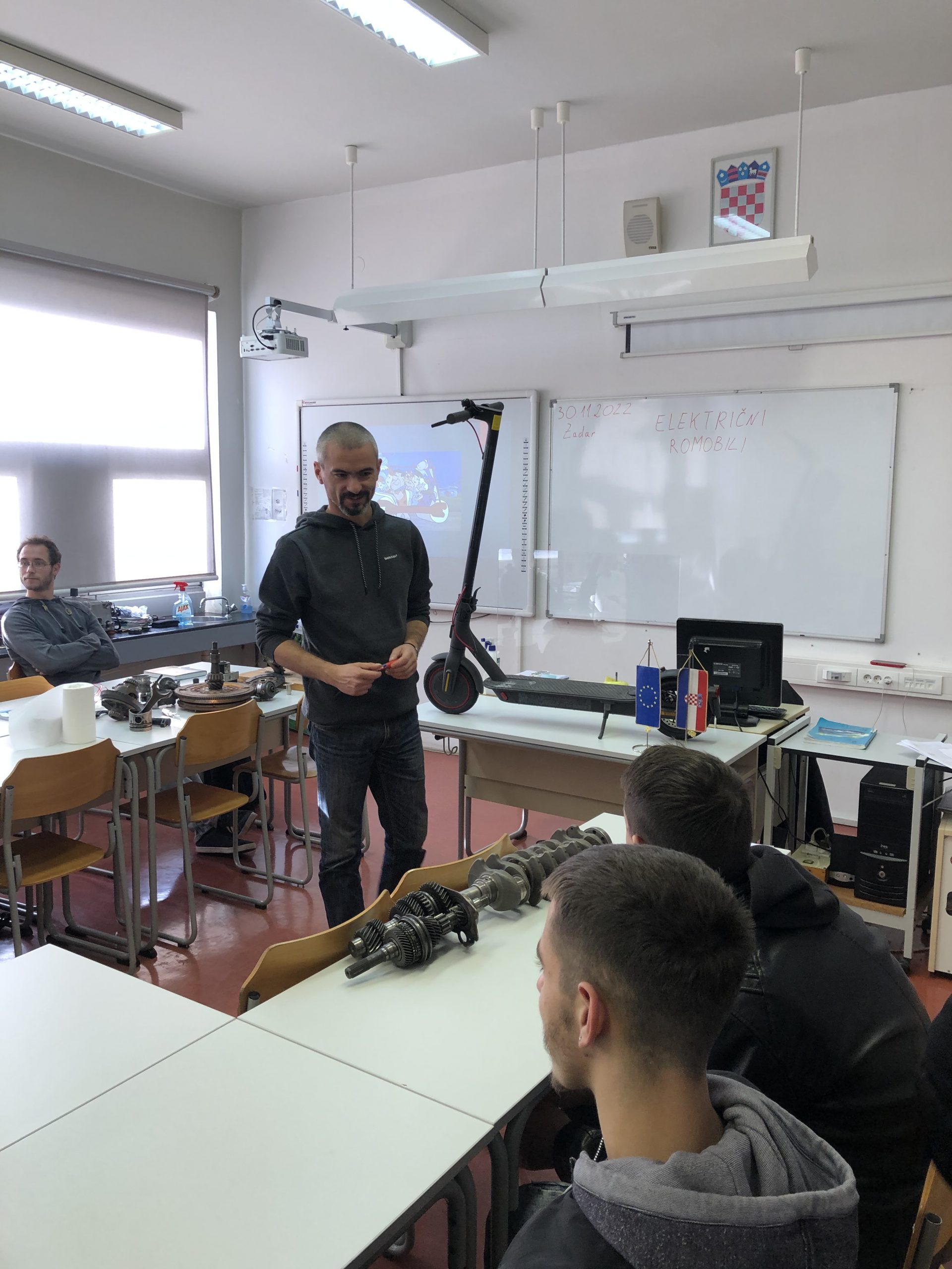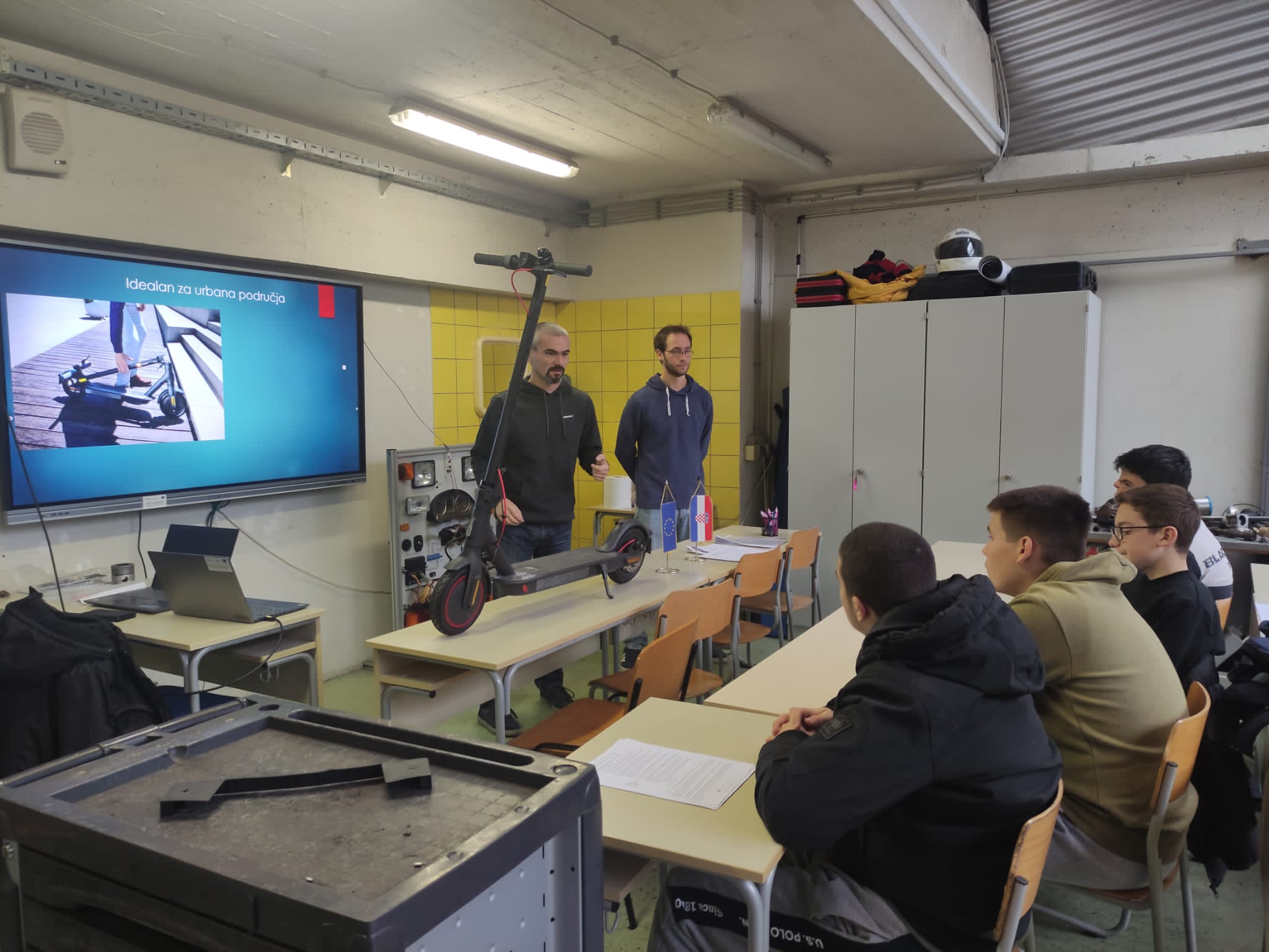 Nastavna tema koju je nastavnik pripremio i održao sa učenicima je Servisiranje električnih romobila. Učenicima je kroz teorijski dio i vizualni dio (slike i praktični primjer) nastavnik objasnio sve elemente koji se nalaze na električnom romobilu, nakon čega je kroz video prikaz pojasnio na koji način se izvodi održavanje ili popravke istog. Upoznati su sa provođenjem postupka i koraka održavanja.